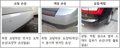 손상유형 분류기준 (해당영역은 좌.우 스크롤이 가능합니다.) 범퍼의 손상유형 분류기준을 구분, 유형, 손상상태설명으로 나누어 설명한 테이블입니다. 구분 유형 손상상태 설명 경미한 손상 제 1유형 투명 코팅막만 벗겨진 도막손상(도장막 손상 없음) 제 2유형 투명 코팅막과 도장막(색상)이 동시에 벗겨진 손상(범퍼소재 손상 없음) 제 3유형 긁힘, 찍힘 등으로 도장막과 함께 범퍼소재의 일부가 손상(구멍 뚫림 없음) 기타손상 · 범퍼 일부분이 찢어진 손상, 함몰, 꺾임, 구멍 등이 생긴 상태 등(경미한 손상의 복원수리 방법으로 복원이 불가...